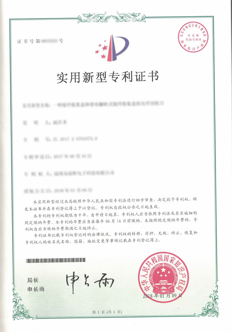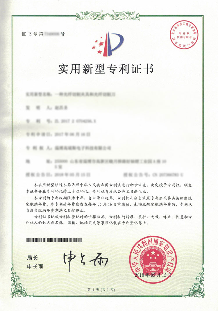 高瑞斯專利證書